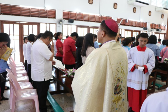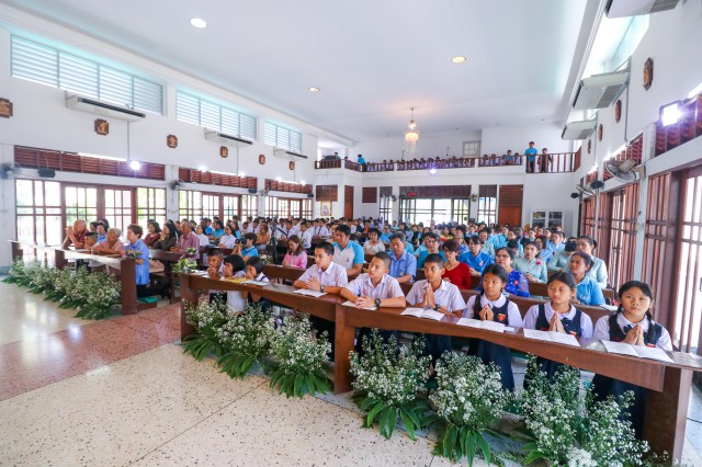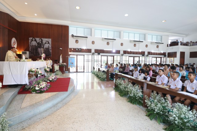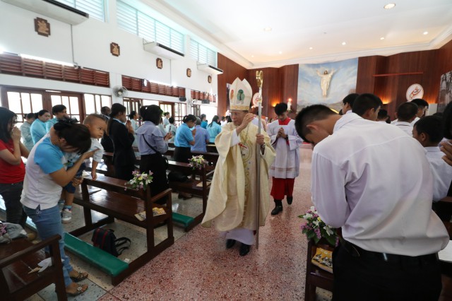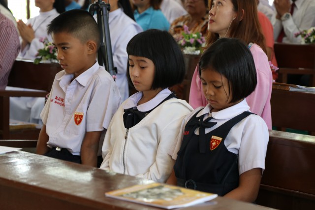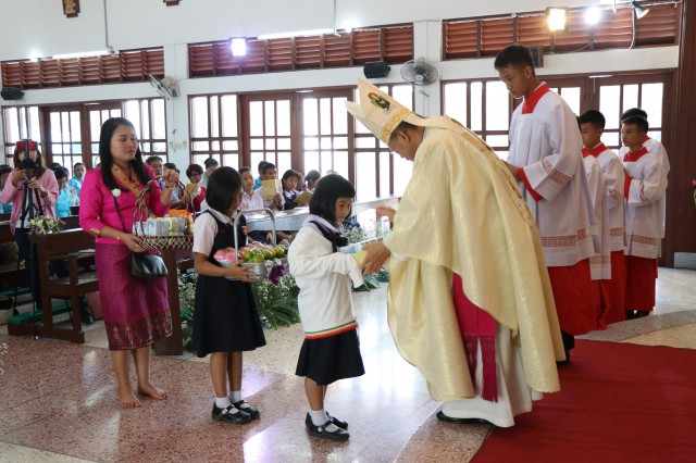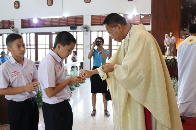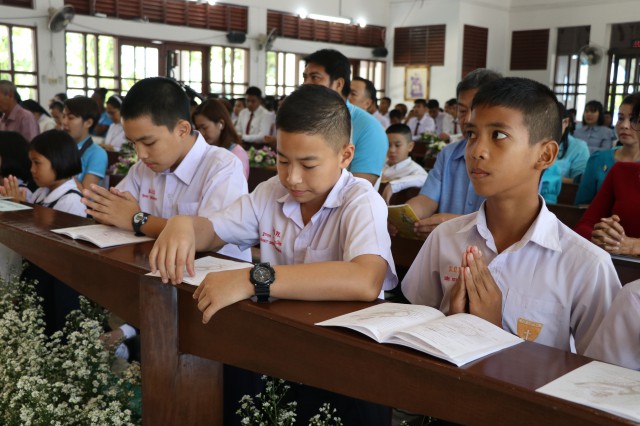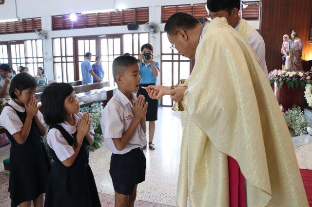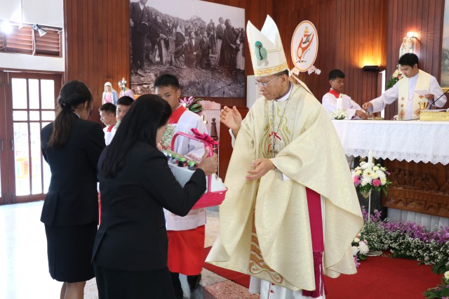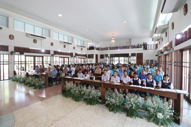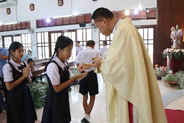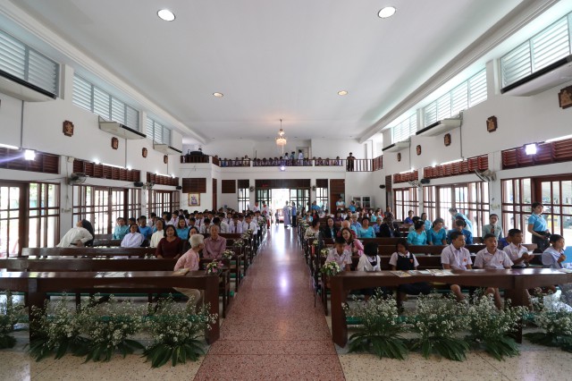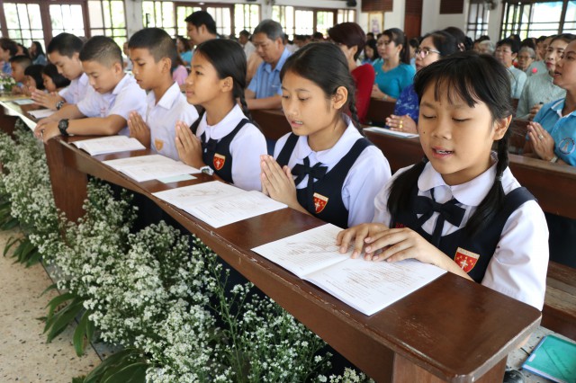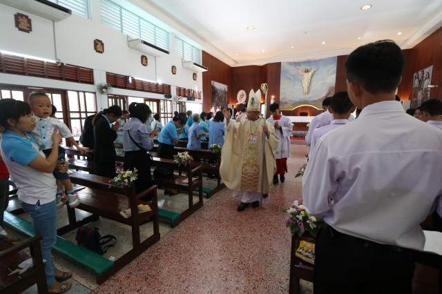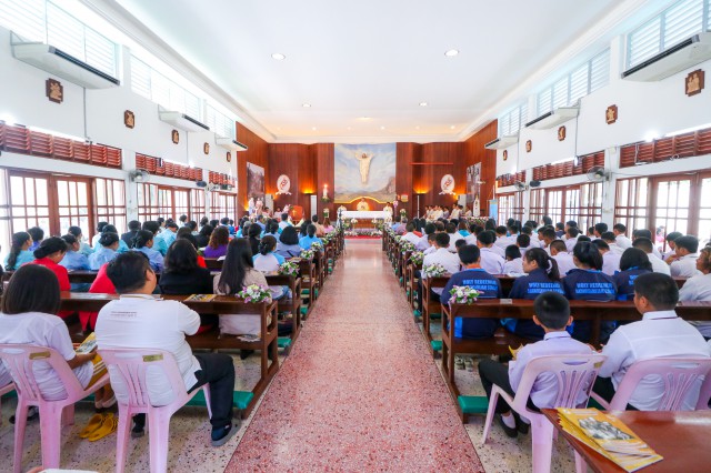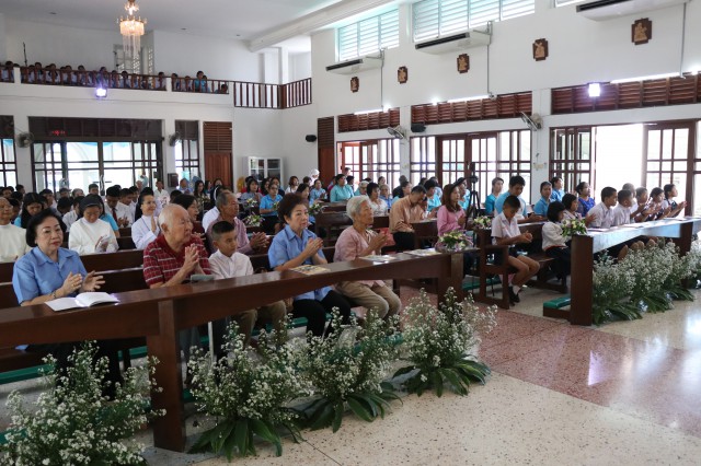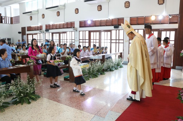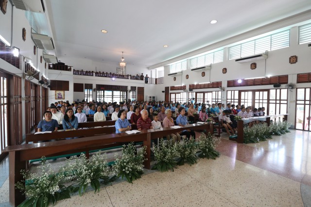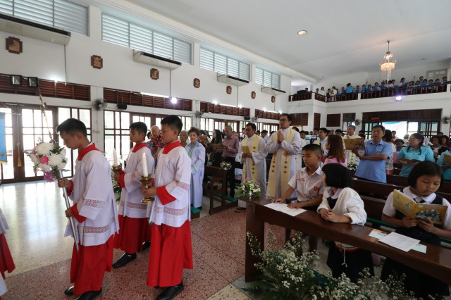 เวลา 10.30 พิธีบูชาขอบพระคุณพระสังฆราชลือชัย เป็นประธานในพิธีในโอกาสนี้ มีนักเรียนชาย-หญิง
