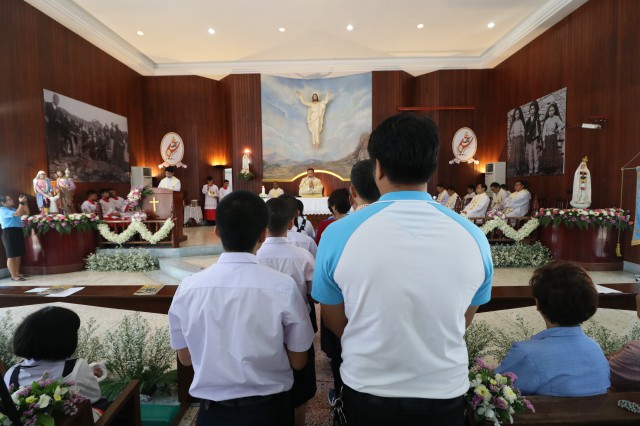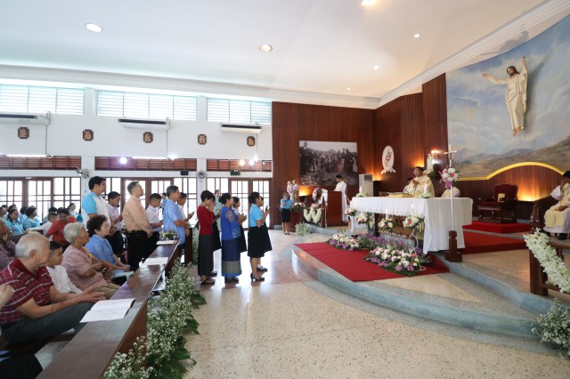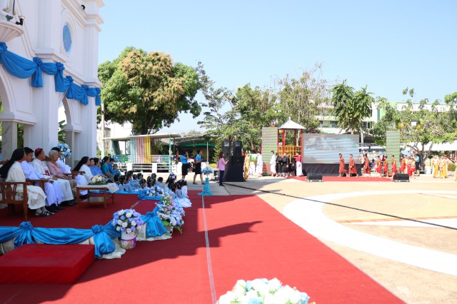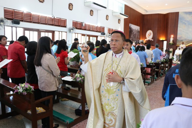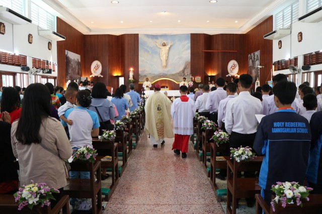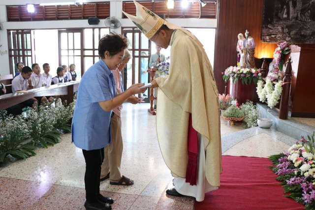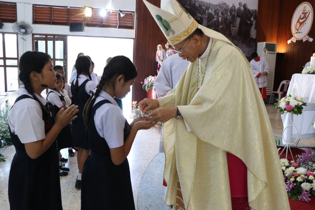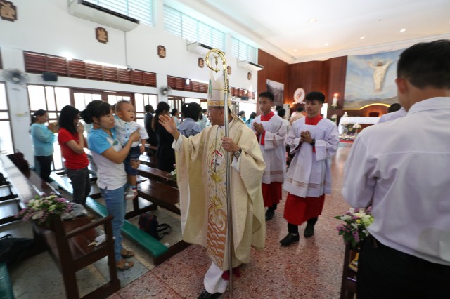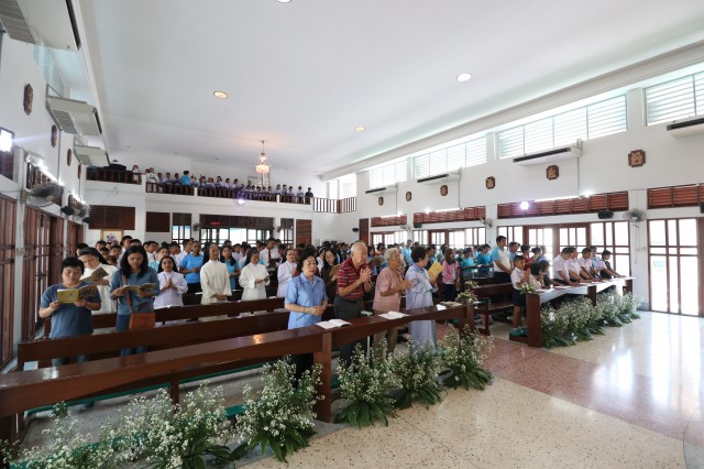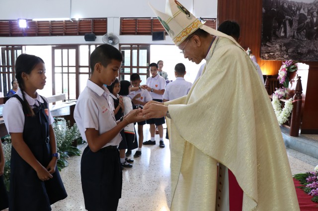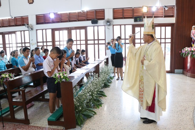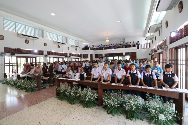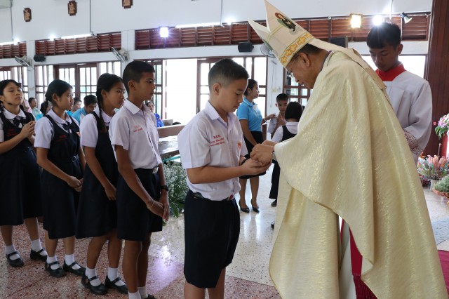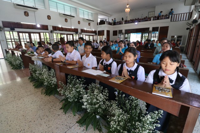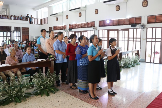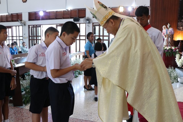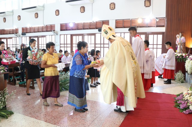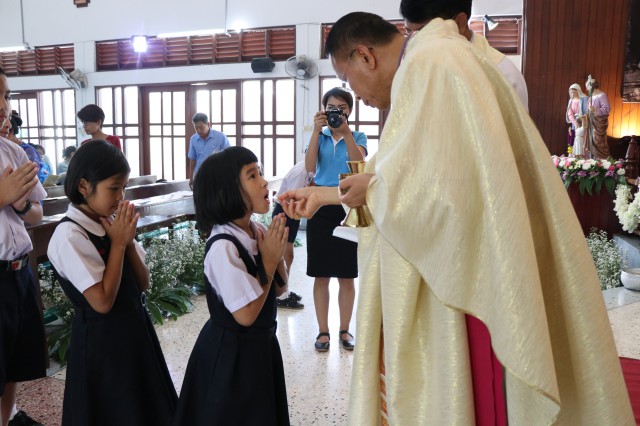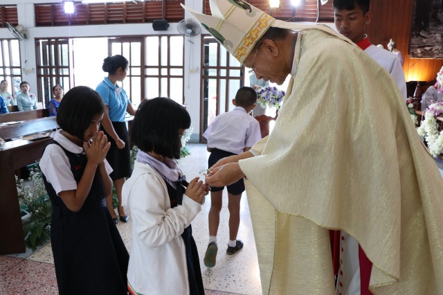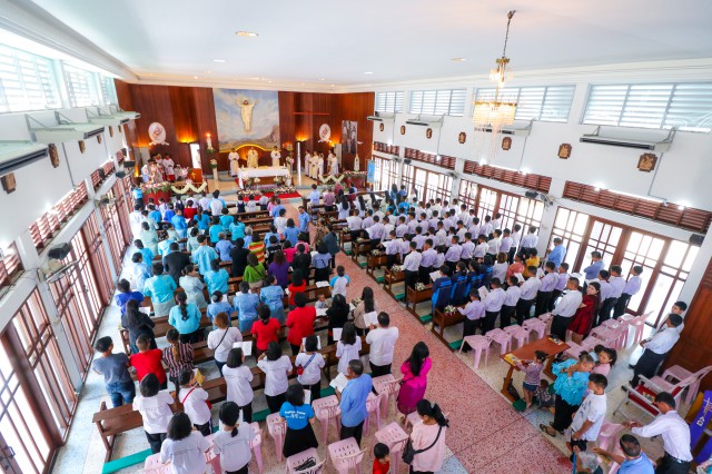 เวลา 10.30 พิธีบูชาขอบพระคุณพระสังฆราชลือชัย เป็นประธานในพิธีในโอกาสนี้ มีนักเรียนชาย-หญิง