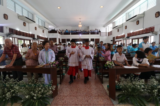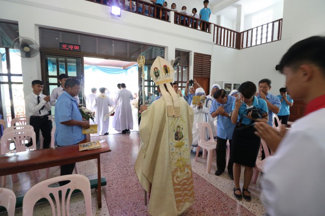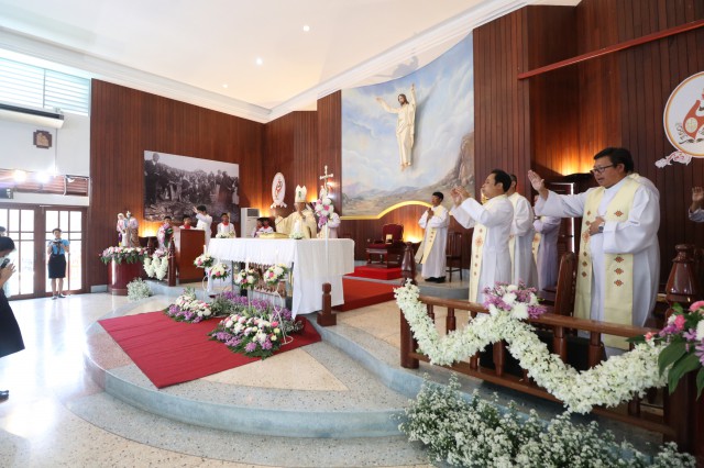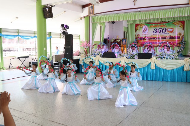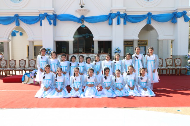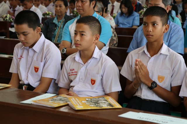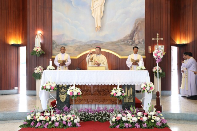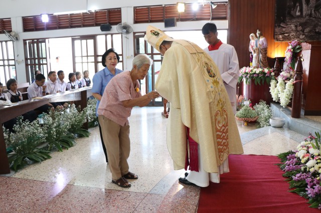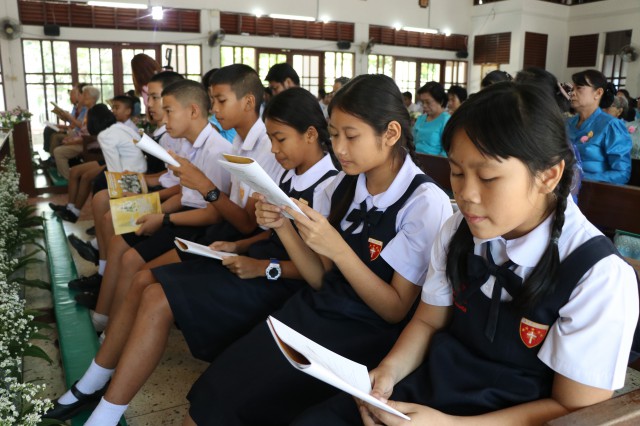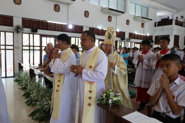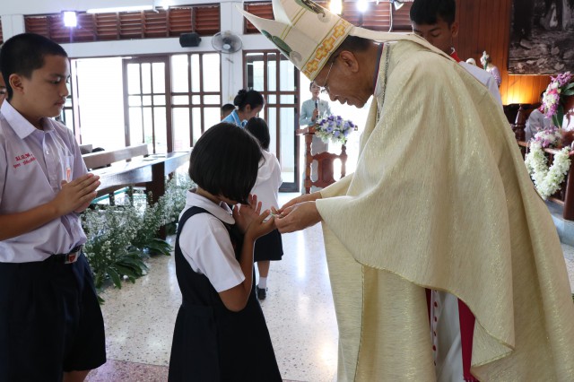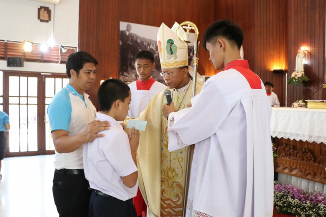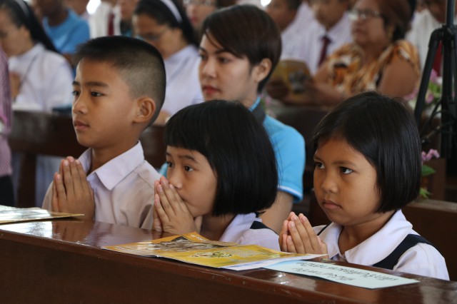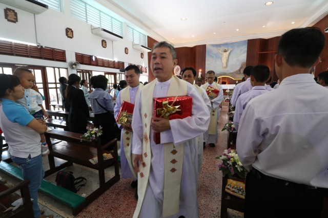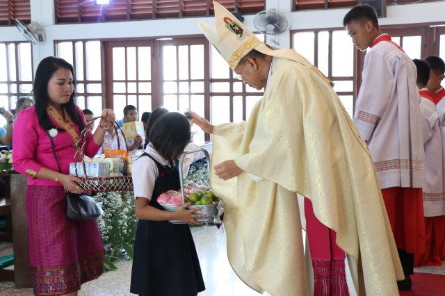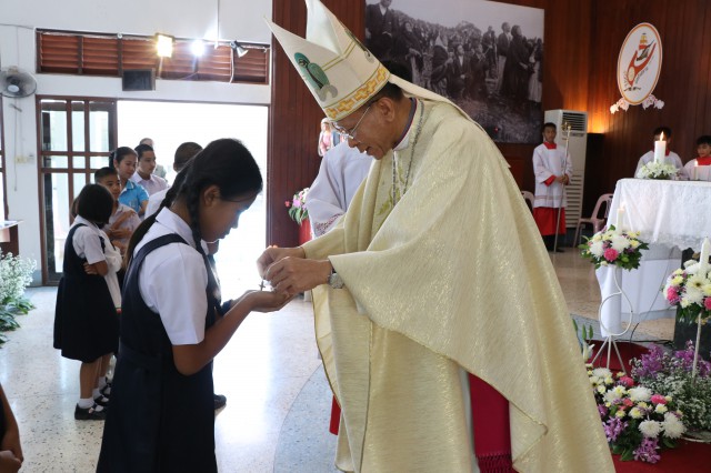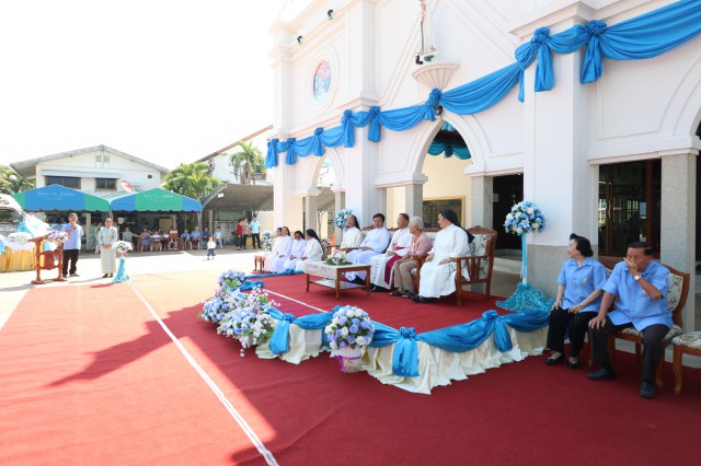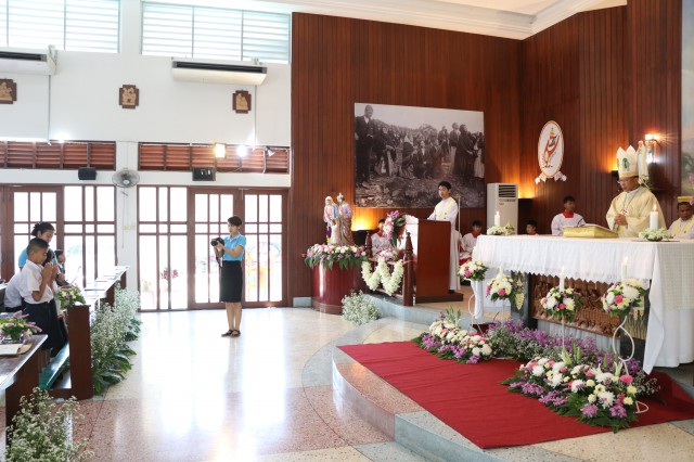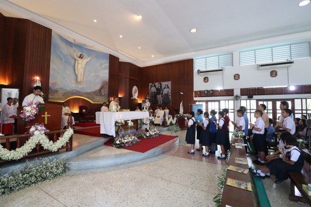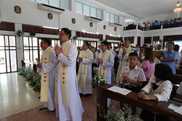 เวลา 10.30 พิธีบูชาขอบพระคุณพระสังฆราชลือชัย เป็นประธานในพิธีในโอกาสนี้ มีนักเรียนชาย-หญิง