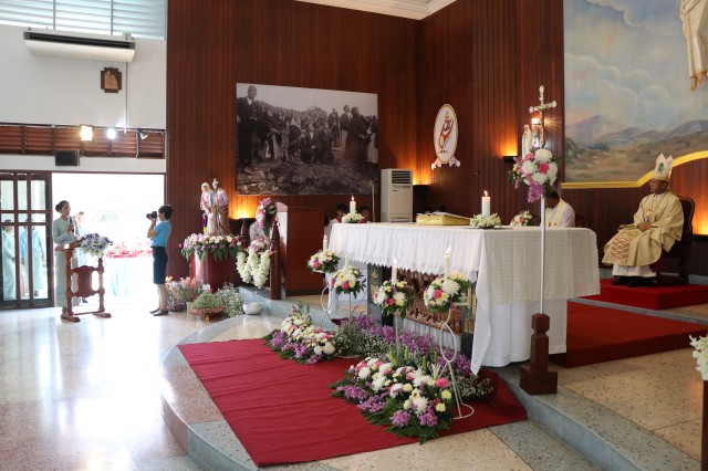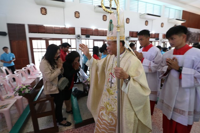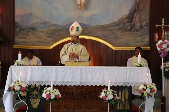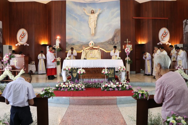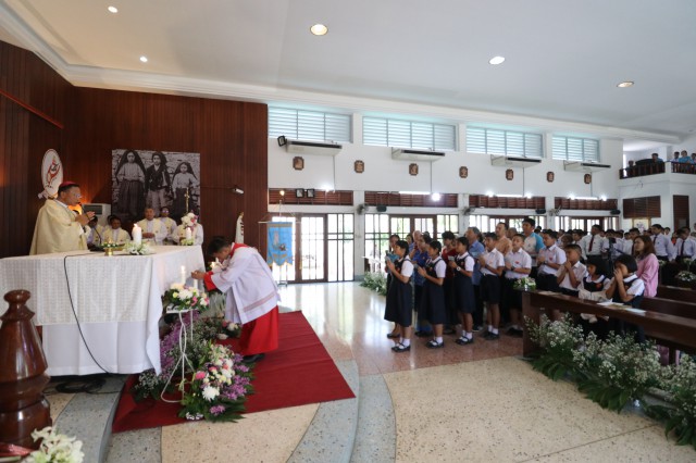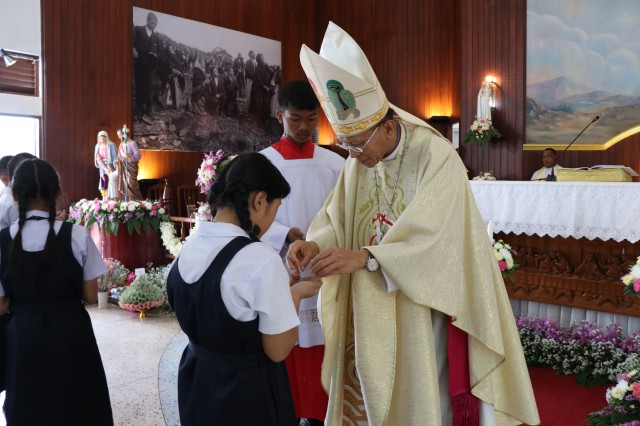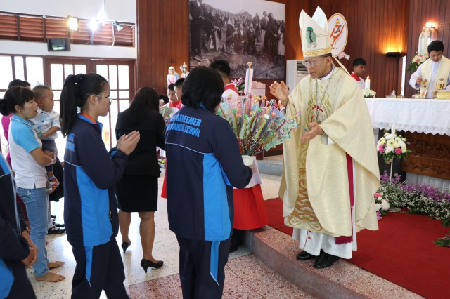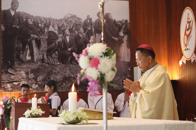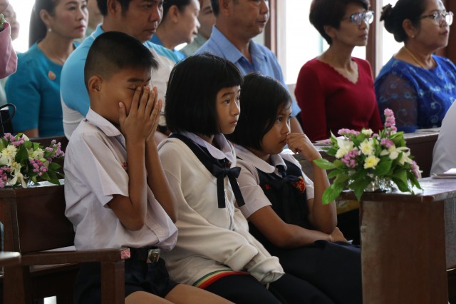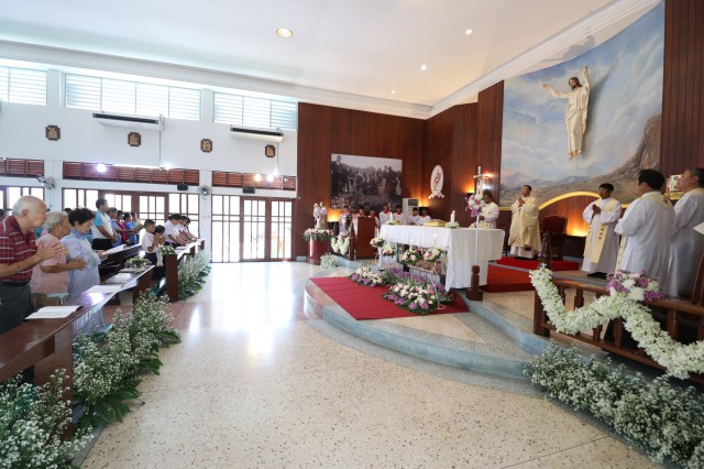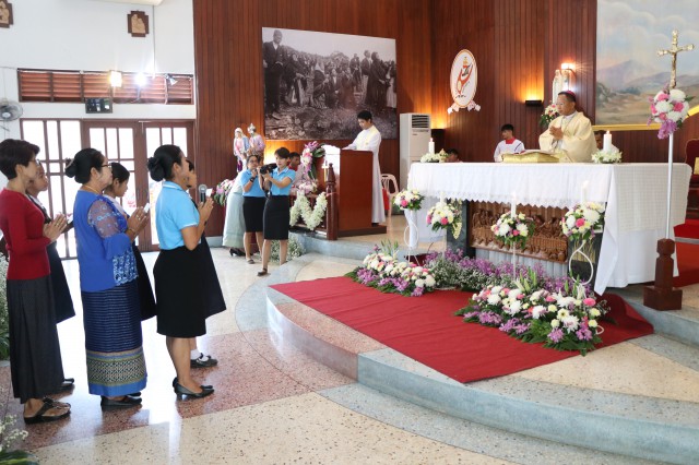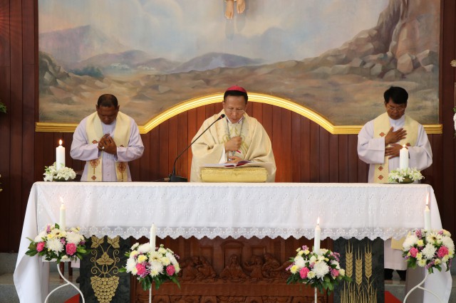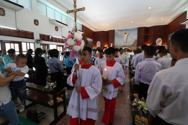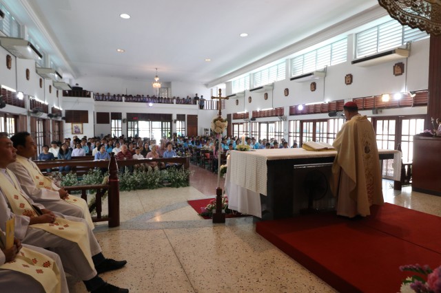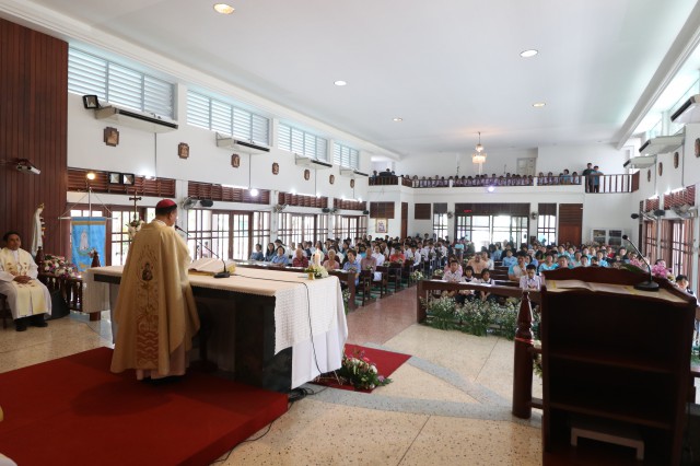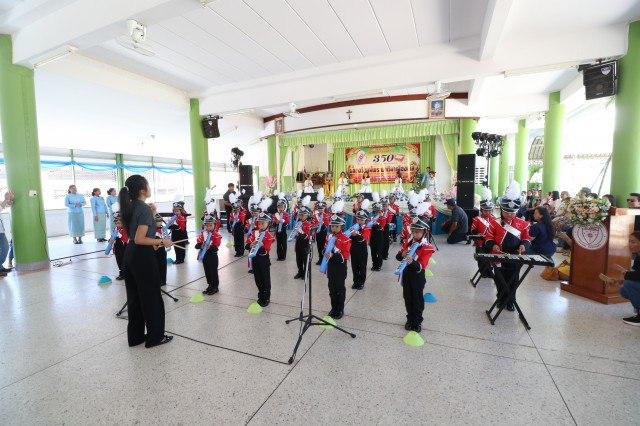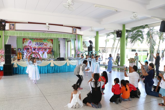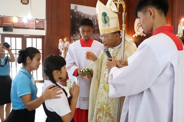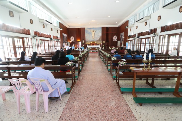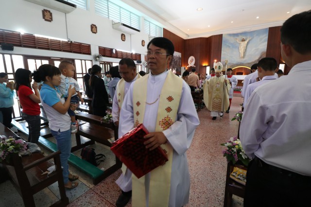 เวลา 10.30 พิธีบูชาขอบพระคุณพระสังฆราชลือชัย เป็นประธานในพิธีในโอกาสนี้ มีนักเรียนชาย-หญิง