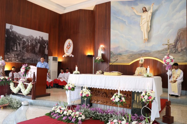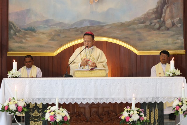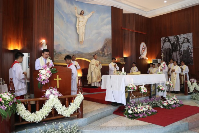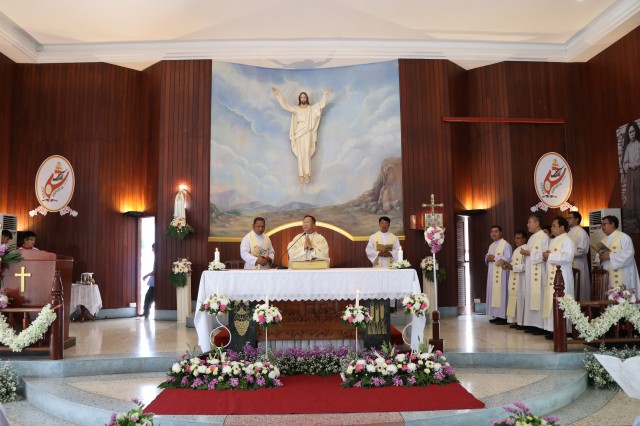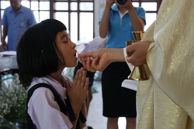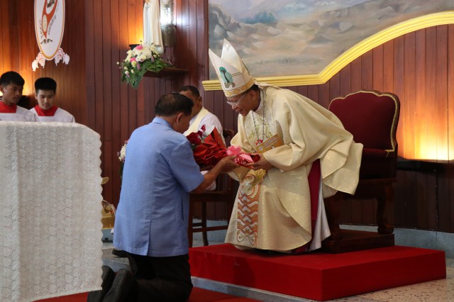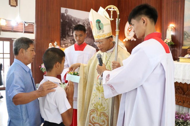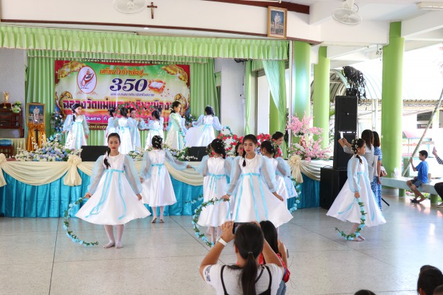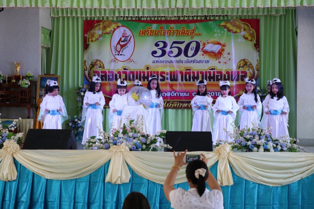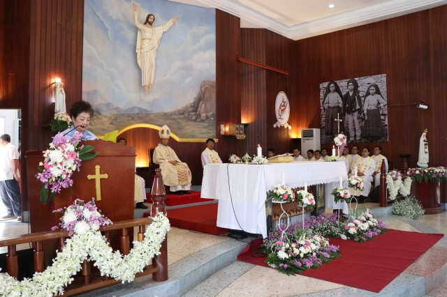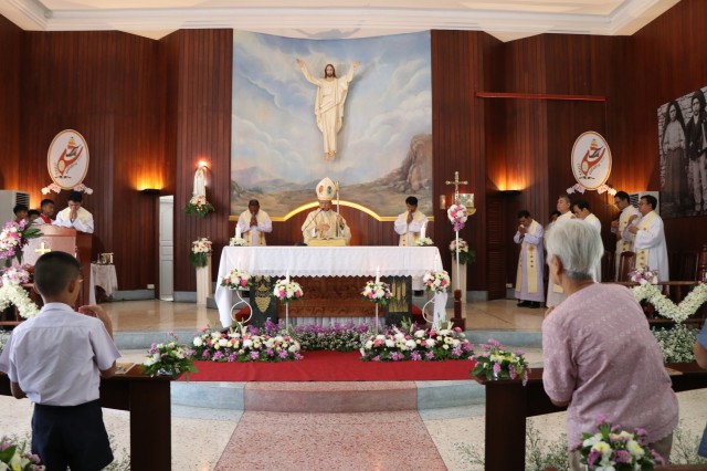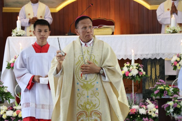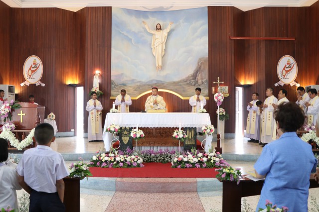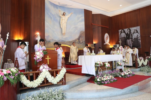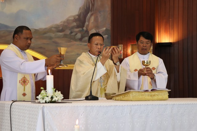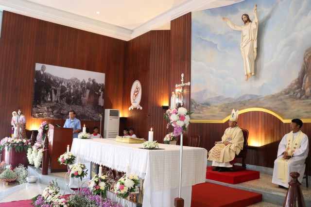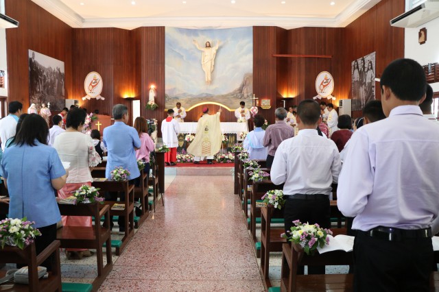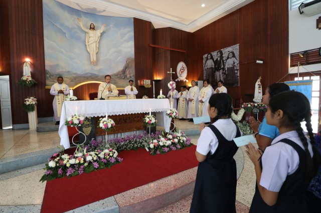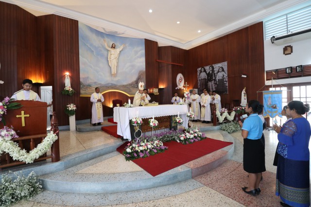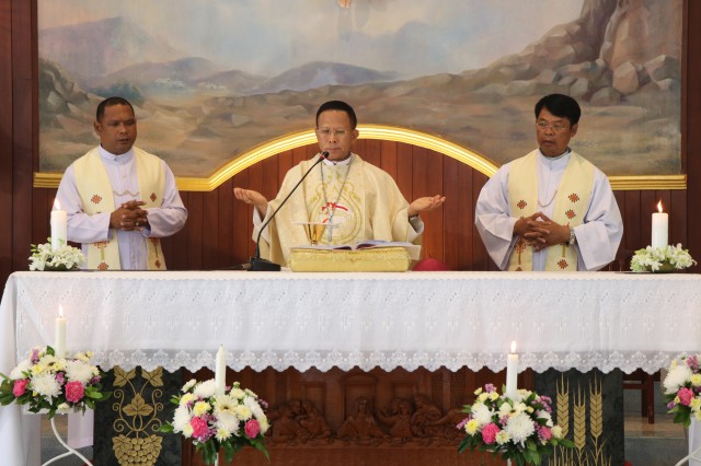 เวลา 10.30 พิธีบูชาขอบพระคุณพระสังฆราชลือชัย เป็นประธานในพิธีในโอกาสนี้ มีนักเรียนชาย-หญิง
