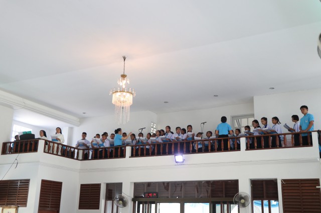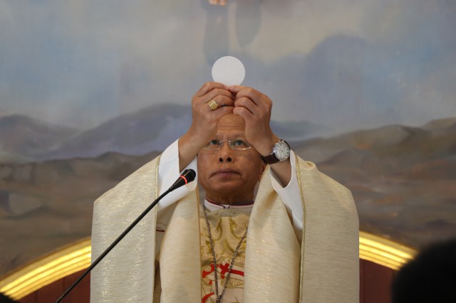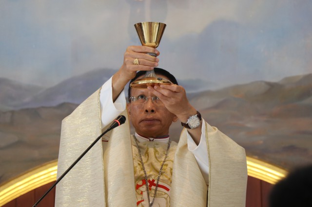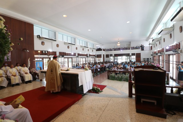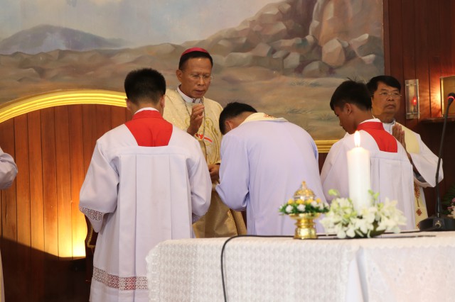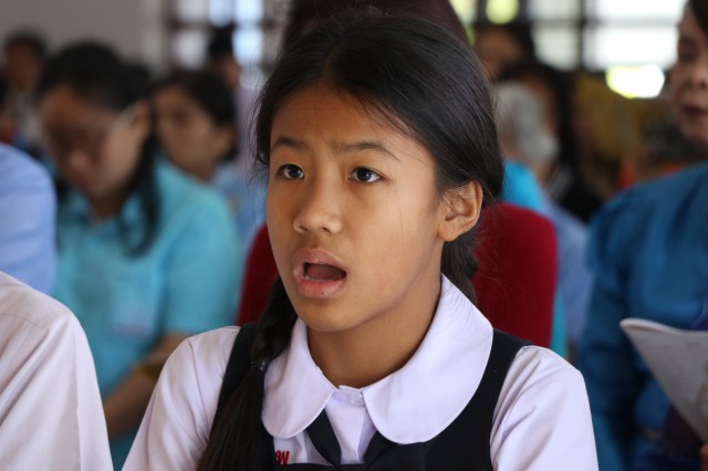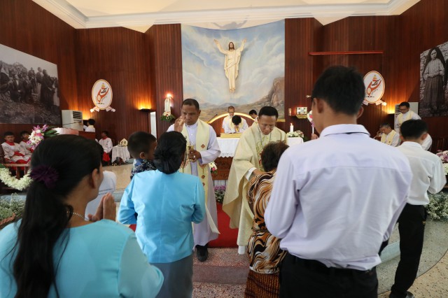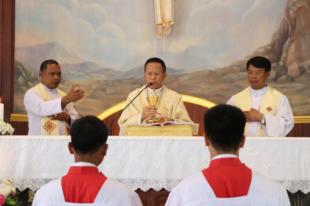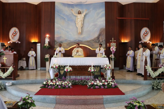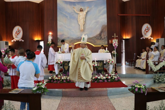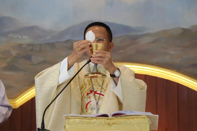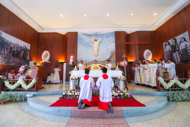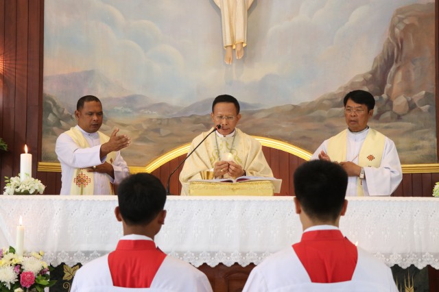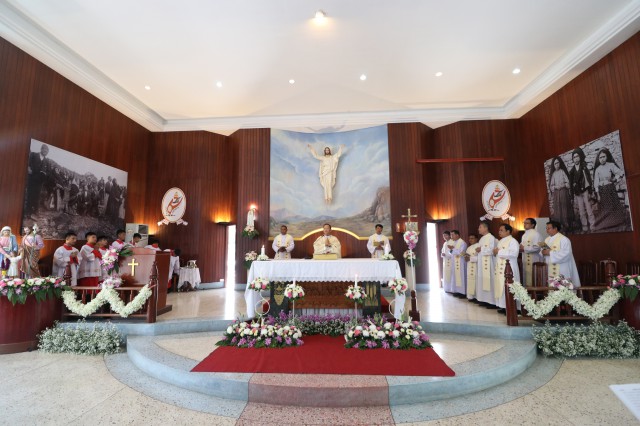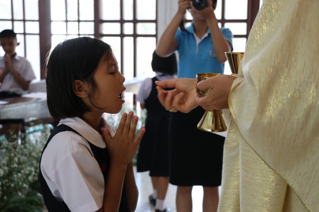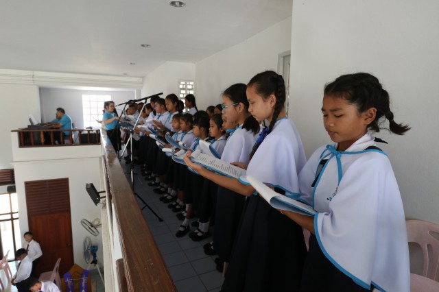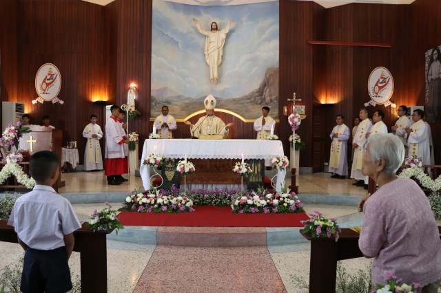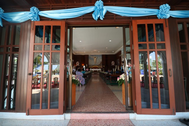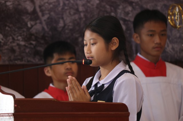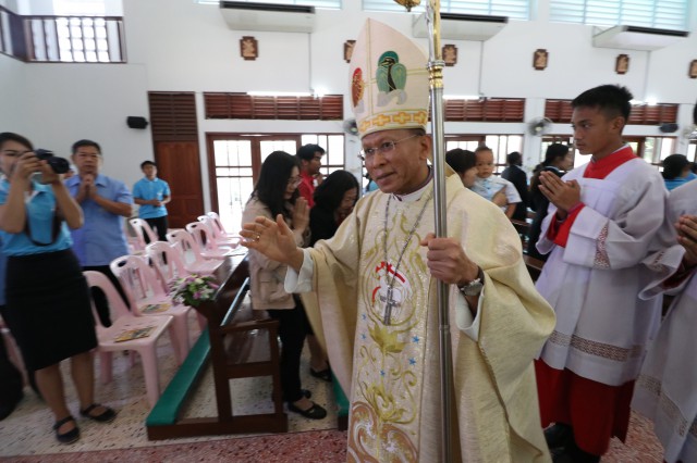 เวลา 10.30 พิธีบูชาขอบพระคุณพระสังฆราชลือชัย เป็นประธานในพิธีในโอกาสนี้ มีนักเรียนชาย-หญิง
